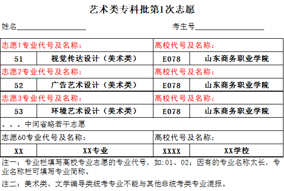 艺术类专科批第1次志愿填报图例