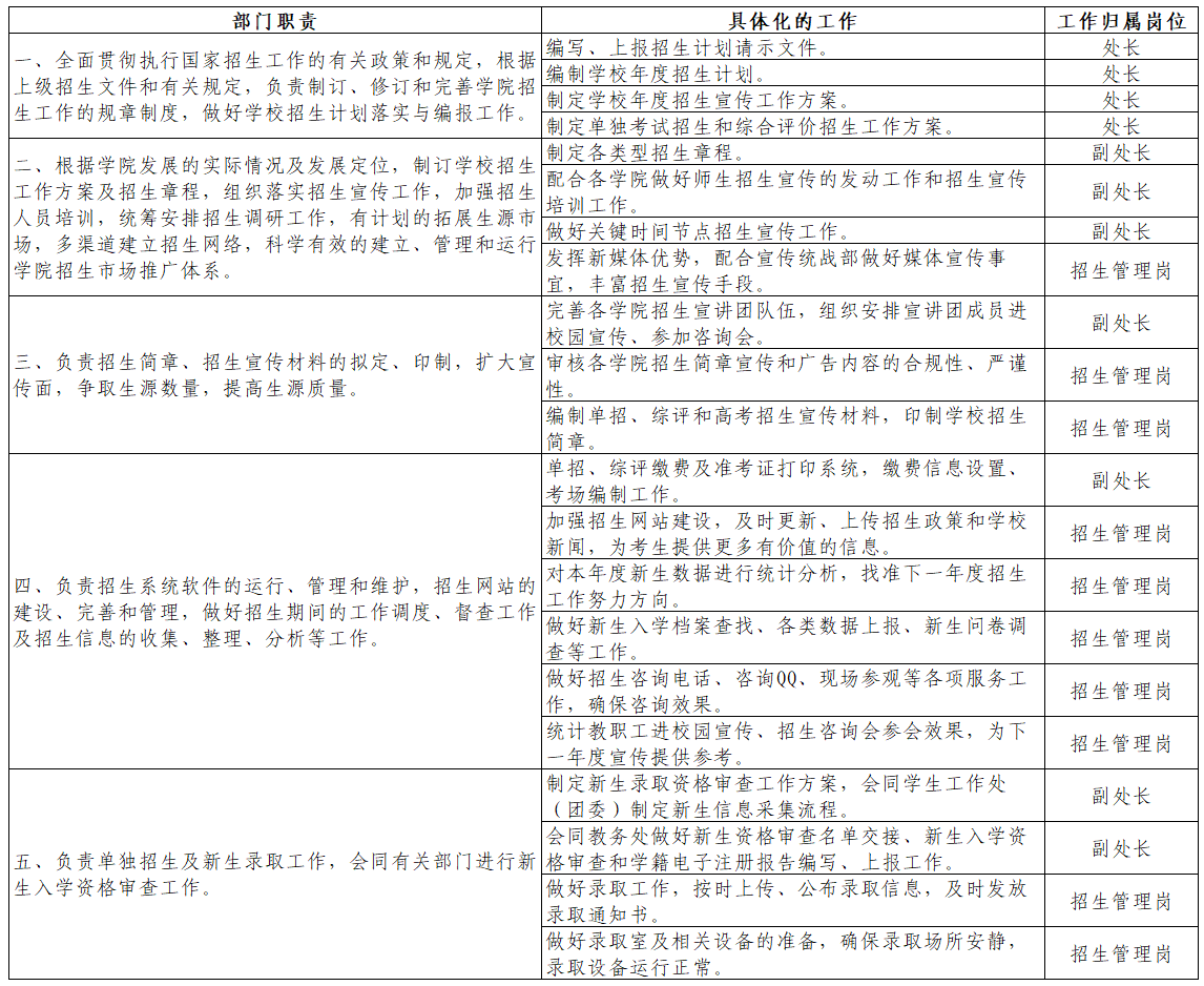 在学校党政领导下,负责制定学校招生政策和招生计划,负责招生宣传、招生录取等工作的职能部门。主要职责是: