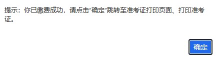 5.手机微信扫码支付成功后,点击“微信支付已完成”,系统提示:你已缴费成功,请点击“确定”跳转至准考证打印页面、打印准考证。如下图: