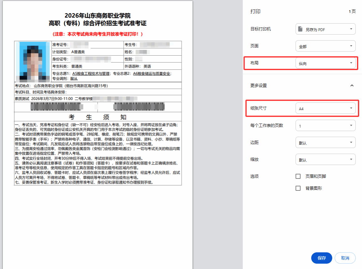 缴费成功后,点击“打印准考证”,打开打印准考证页面,核对个人信息无误后,点击页面最下方“打印准考证”按钮,自动弹出打印页面,页面布局选择“纵向”,纸张尺寸选择“A4”,其他选项默认。如下图: