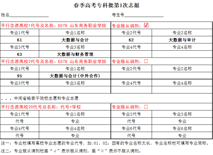 (三)春季高考专科批:专业类别内平行志愿模式,以学校为志愿单位,考生可填报20个高校志愿,每个高校志愿可填报4个专业及1个专业服从调剂志愿,填报的专业类别须与报名和考试的专业类别一致。春季高考技能拔尖人才志愿仅限经省教育招生考试院网站公示的技能拔尖人才填报,未被本科录取的考生在专科批志愿中继续填报。