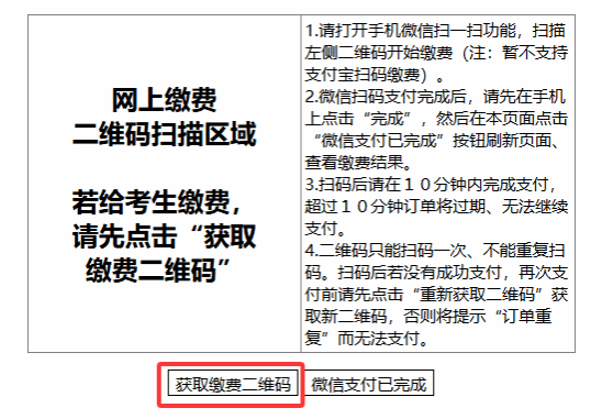 2.微信扫码支付完成后,请先在手机上点击“完成”,然后在本页面点击“微信支付已完成”按钮刷新页面、查看缴费结果。