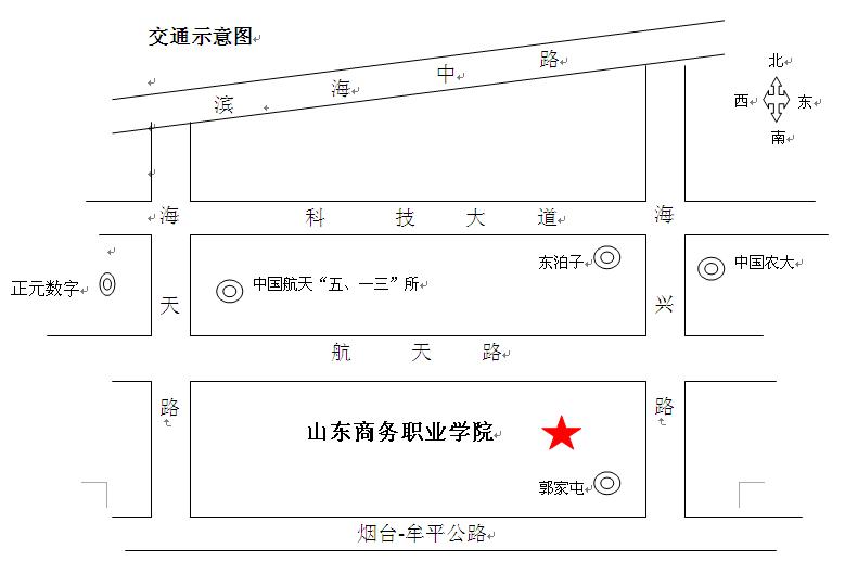 从牟平城向西沿牟平-烟台的公路直走,到达郭家屯路口(路右边指示牌有“山东商务职业学院”的指示)右转,向前(即向北)沿海兴路直走1.5公里即可到达学校大门口(路左边)。