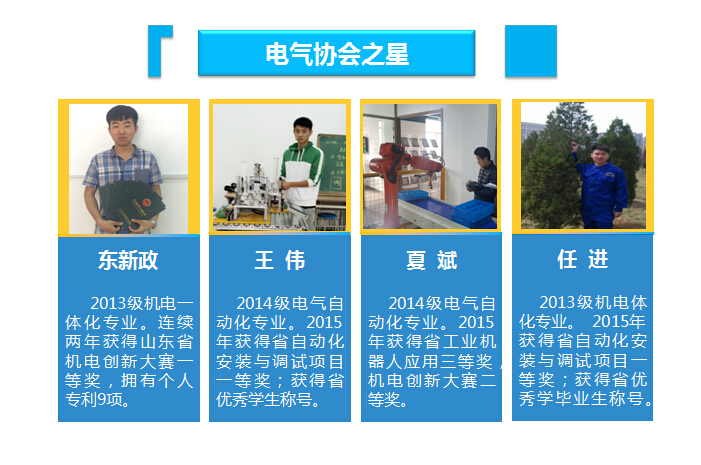 2017年电气学子以满分成绩,勇夺全国职业技能大赛“工业机器人技术应用”项目一等奖第一名。2018年,获得全国职业技能大赛“机电一体化”项目二等奖,山东省赛二等奖;2014-2016年分别获得山东省技能大赛“自动化生产线安装与调试”项目一等奖一次、二等奖两次;2015年获得山东省机电创新大赛二等奖1项、三等奖2项。获得省赛一等奖的学生,他们均以专业课满分的成绩进入本科学院。